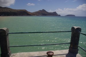 Ein langer Steg, früher der Anleger für die Fähren führt aufs karibikblaue Meer hinaus.