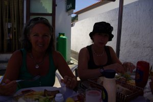 In Mosteiros machen wir kurz Rast und bestellen in einer Cervejarea das „Prato do Dia“: Rippchen mit Salat, Pommes und Reis. Schmeckt sehr lecker und ist preiswert. Auch der gekochte Tintenfisch oder die gebackenen Muscheln am Nachbartisch sehen lecker aus.
