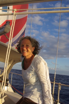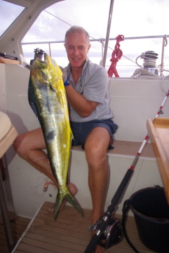 Die Sonne versinkt gemächlich am Horizont, der Wind frischt etwas auf, 6 Knoten zeigt die Logge. Plötzlich macht es kurz aber entschieden siiiiirrrr. “Fischalarm”. Langsam wickelt Johannes die Leine auf und bald ist klar, da hängt eine Goldmakrele am Haken und was für eine. Es braucht Zeit und Gefühl weil wir unter Bliester Bacchus nicht so einfach bremsen können und wenn wir die Leine zu schnell ranziehen verlieren wir Ihn wieder. Aber schlussendlich liegt das Prachtexemplar im Cockpit…