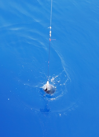 Um die Mittagszeit beißt doch tatsächlich ein kleiner Tunfisch an und so haben wir auch gleich unser Abendessen an Bord.